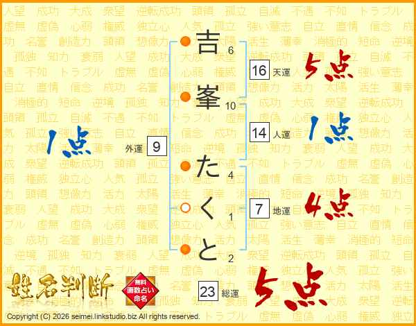 吉(6画)峯(10画) た(4画)く(1画)と(2画)