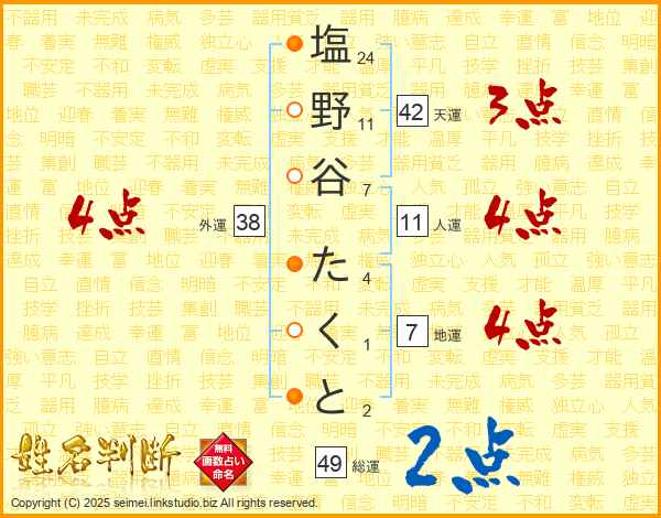 塩野谷たくとさんの人運は11画の4点!
