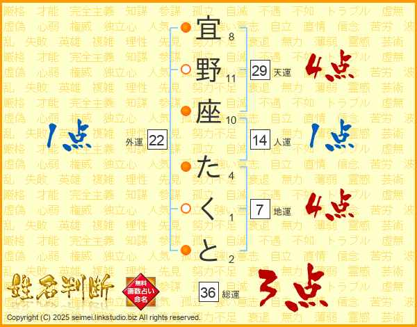 宜(8画)野(11画)座(10画) た(4画)く(1画)と(2画)