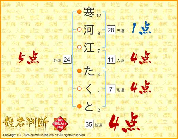 寒(12画)河(9画)江(7画) た(4画)く(1画)と(2画)