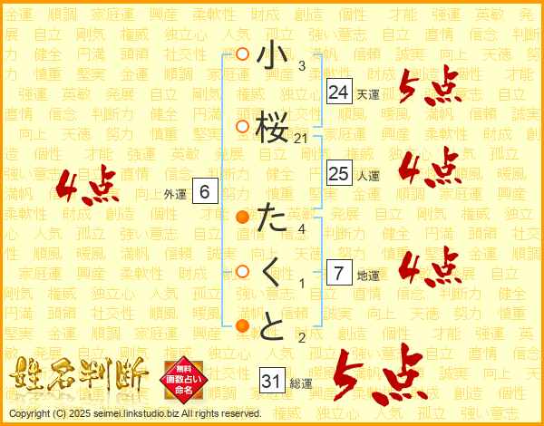 あなたの人生を表す1番重要な運勢です。生涯を通じて影響する総合運となり、主に50歳以降の晩年期に影響を及ぼします。苗字と名前の合計画数。