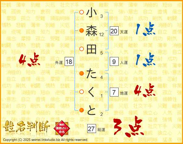 小(3画)森(12画)田(5画) た(4画)く(1画)と(2画)