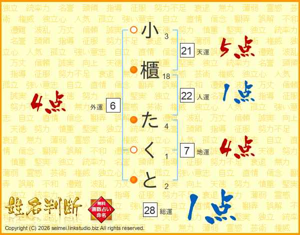 小櫃たくとさんの天運は21画の5点!