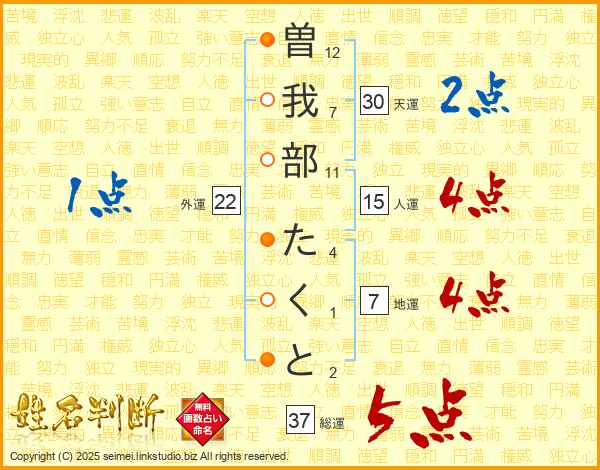 曽(12画)我(7画)部(11画) た(4画)く(1画)と(2画)