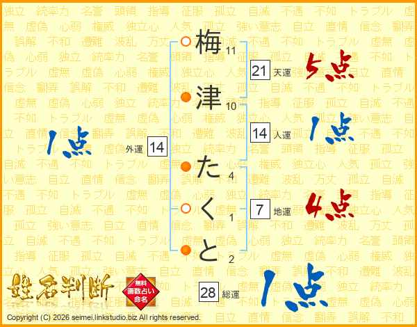 梅津たくとさんの天運は21画の5点!
