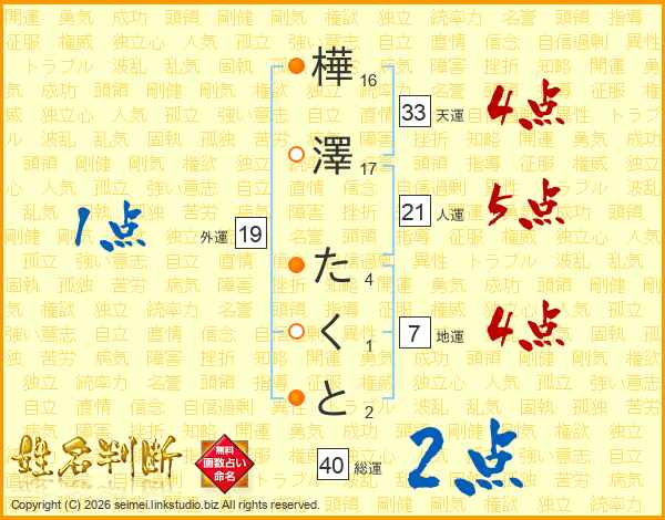樺(16画)澤(17画) た(4画)く(1画)と(2画)