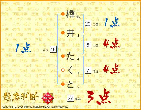 あなたの人生を表す1番重要な運勢です。生涯を通じて影響する総合運となり、主に50歳以降の晩年期に影響を及ぼします。苗字と名前の合計画数。