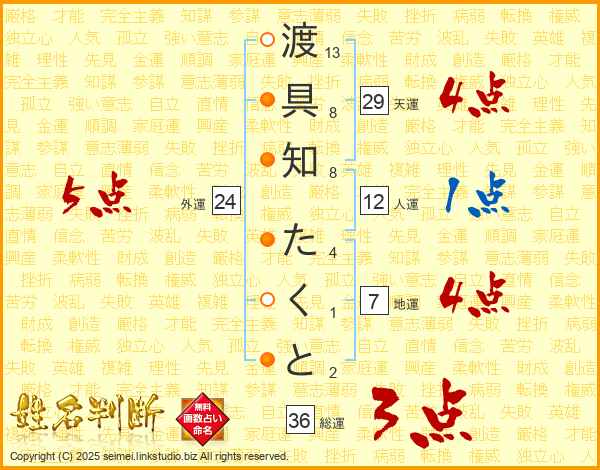 あなたの人生を表す1番重要な運勢です。生涯を通じて影響する総合運となり、主に50歳以降の晩年期に影響を及ぼします。苗字と名前の合計画数。