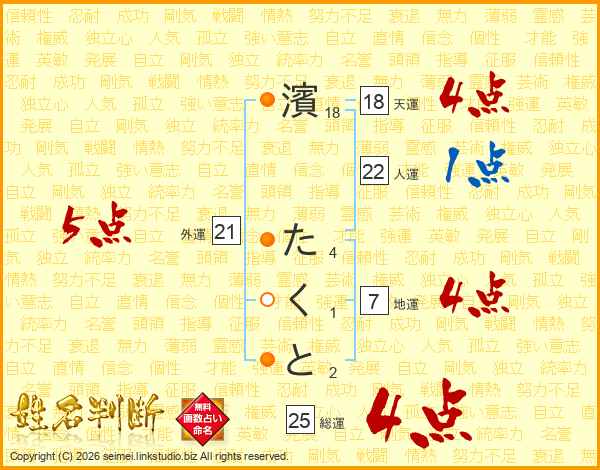 あなたの人生を表す1番重要な運勢です。生涯を通じて影響する総合運となり、主に50歳以降の晩年期に影響を及ぼします。苗字と名前の合計画数。