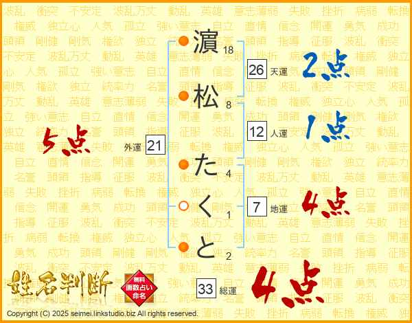 あなたの人生を表す1番重要な運勢です。生涯を通じて影響する総合運となり、主に50歳以降の晩年期に影響を及ぼします。苗字と名前の合計画数。