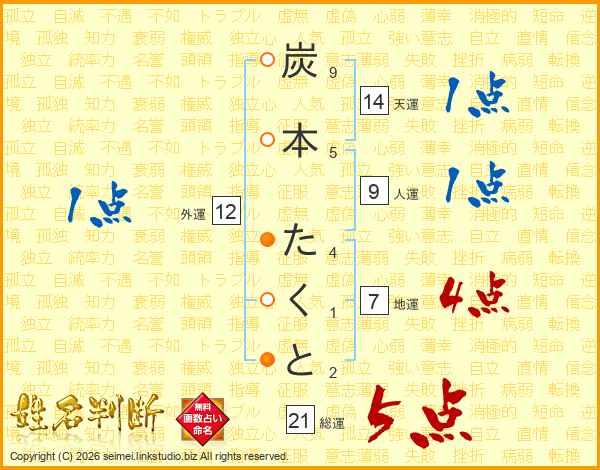 炭本たくとさんの総運は21画の5点!