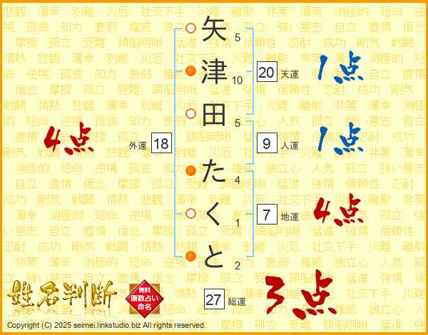 矢(5画)津(10画)田(5画) た(4画)く(1画)と(2画)
