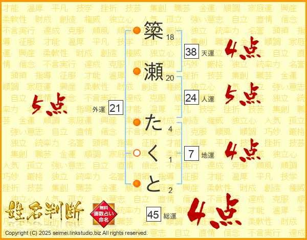 あなたの人生を表す1番重要な運勢です。生涯を通じて影響する総合運となり、主に50歳以降の晩年期に影響を及ぼします。苗字と名前の合計画数。