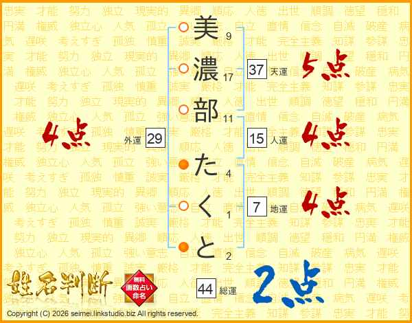 美濃部たくとさんの天運は37画の5点!