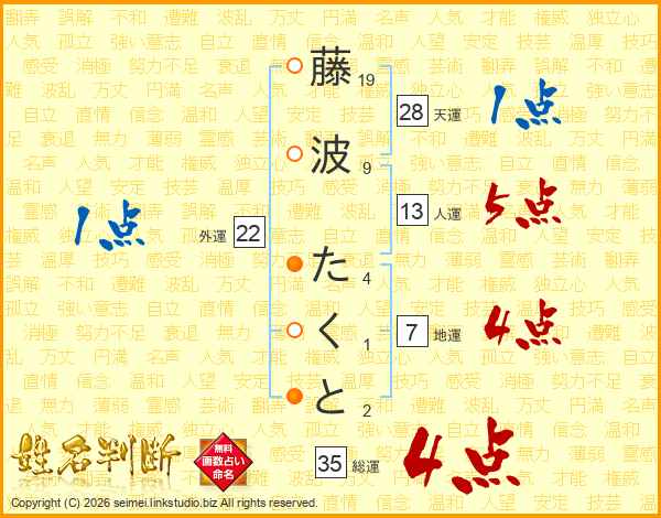 藤(19画)波(9画) た(4画)く(1画)と(2画)