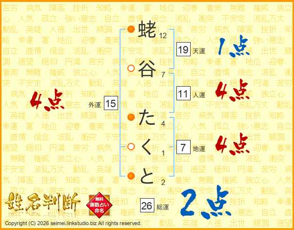 蛯(12画)谷(7画) た(4画)く(1画)と(2画)