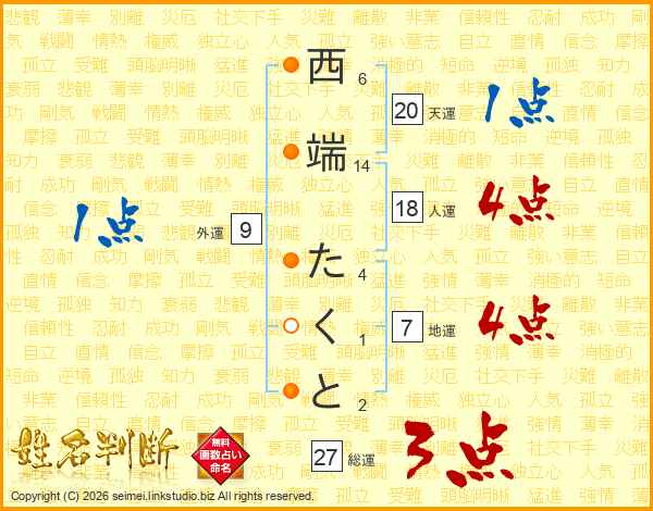西端たくとさんの人運は18画の4点!