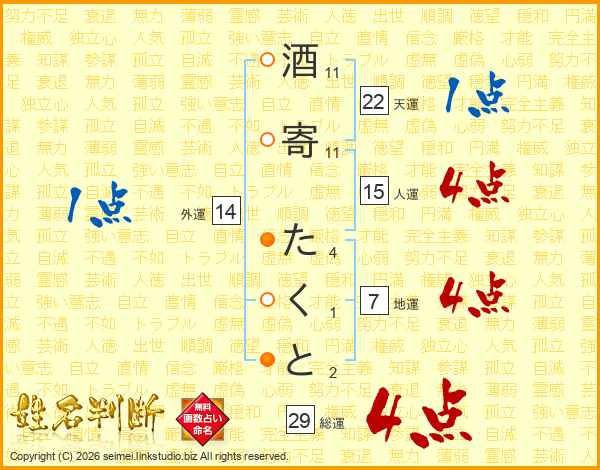 生活面を象徴する運勢です。外部から受ける影響力を表し、結婚運、家庭運や職場、環境への順応性を表します。総運から人運を引いた画数。姓や名が1文字の場合を除く。