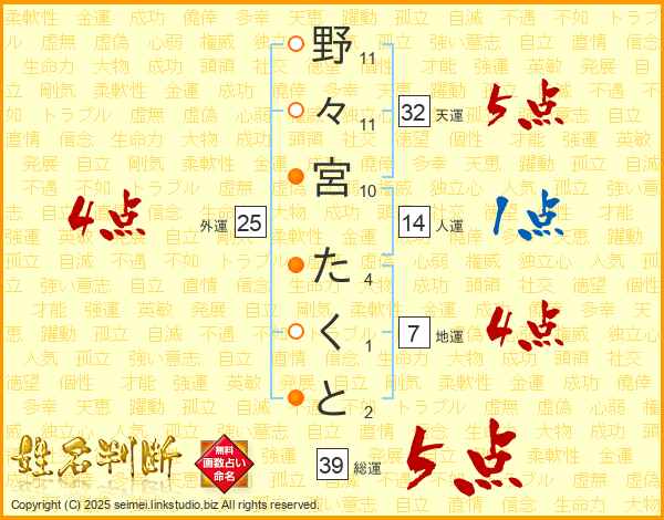 生活面を象徴する運勢です。外部から受ける影響力を表し、結婚運、家庭運や職場、環境への順応性を表します。総運から人運を引いた画数。姓や名が1文字の場合を除く。