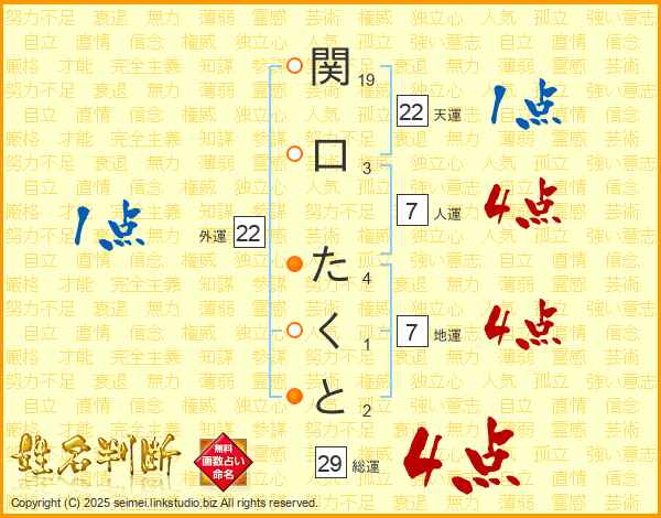 あなたの人生を表す1番重要な運勢です。生涯を通じて影響する総合運となり、主に50歳以降の晩年期に影響を及ぼします。苗字と名前の合計画数。