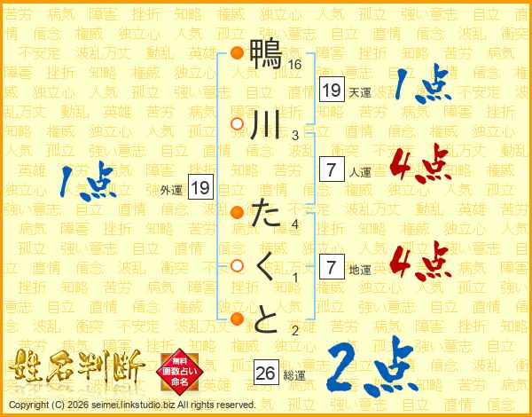 生活面を象徴する運勢です。外部から受ける影響力を表し、結婚運、家庭運や職場、環境への順応性を表します。総運から人運を引いた画数。姓や名が1文字の場合を除く。