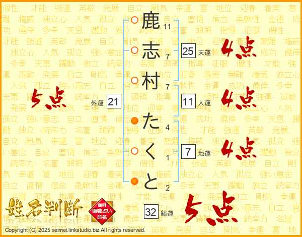 鹿(11画)志(7画)村(7画) た(4画)く(1画)と(2画)
