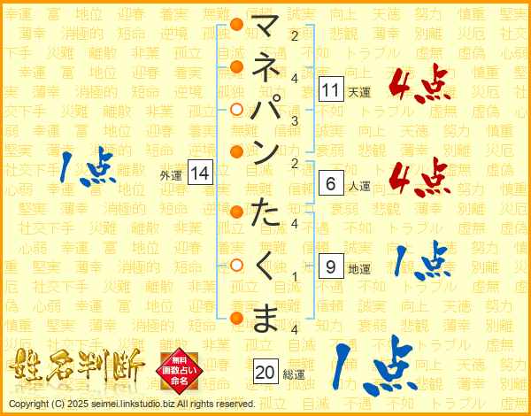 生活面を象徴する運勢です。外部から受ける影響力を表し、結婚運、家庭運や職場、環境への順応性を表します。総運から人運を引いた画数。姓や名が1文字の場合を除く。