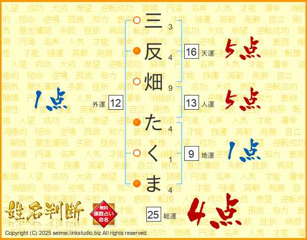 生活面を象徴する運勢です。外部から受ける影響力を表し、結婚運、家庭運や職場、環境への順応性を表します。総運から人運を引いた画数。姓や名が1文字の場合を除く。