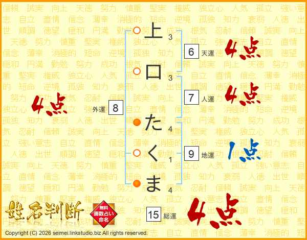 上口たくまさんの総運は15画の4点!