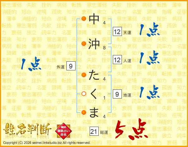 中沖たくまさんの総運は21画の5点!