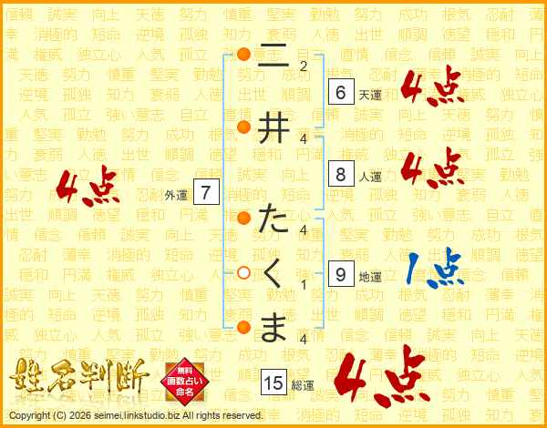 あなたの人生を表す1番重要な運勢です。生涯を通じて影響する総合運となり、主に50歳以降の晩年期に影響を及ぼします。苗字と名前の合計画数。