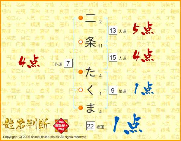 あなたの人生を表す1番重要な運勢です。生涯を通じて影響する総合運となり、主に50歳以降の晩年期に影響を及ぼします。苗字と名前の合計画数。