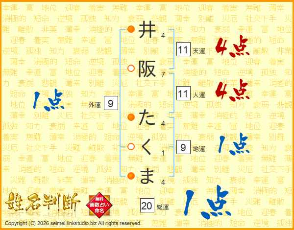 井(4画)阪(7画) た(4画)く(1画)ま(4画)