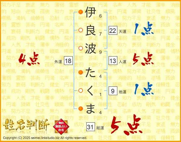 伊(6画)良(7画)波(9画) た(4画)く(1画)ま(4画)