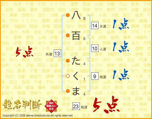 八(8画)百(6画) た(4画)く(1画)ま(4画)