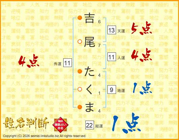 吉尾たくまさんの総運は22画の1点!