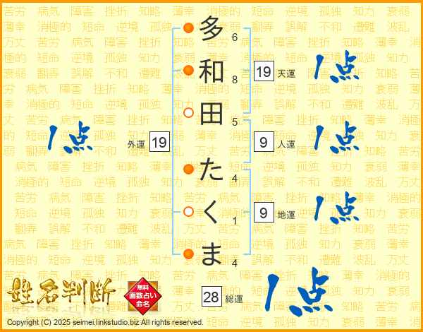 生活面を象徴する運勢です。外部から受ける影響力を表し、結婚運、家庭運や職場、環境への順応性を表します。総運から人運を引いた画数。姓や名が1文字の場合を除く。