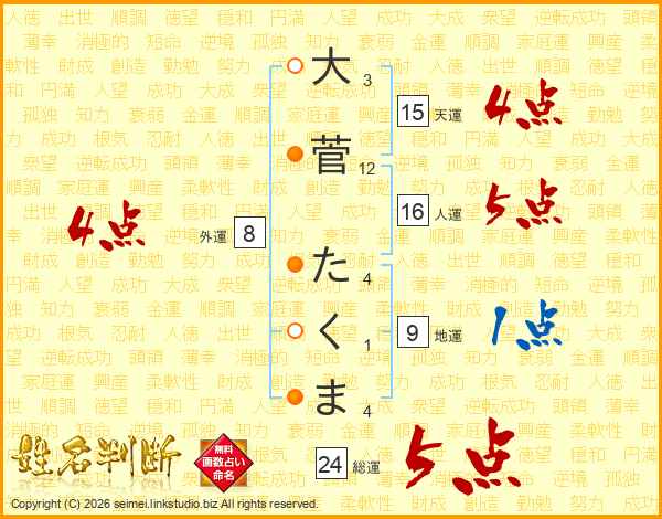 大(3画)菅(12画) た(4画)く(1画)ま(4画)