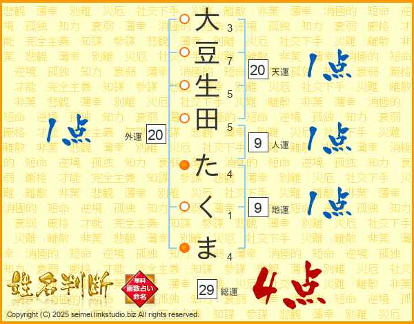大(3画)豆(7画)生(5画)田(5画) た(4画)く(1画)ま(4画)