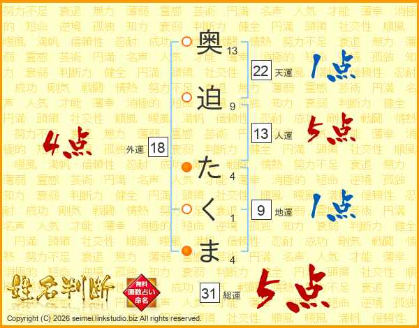 奥(13画)迫(9画) た(4画)く(1画)ま(4画)