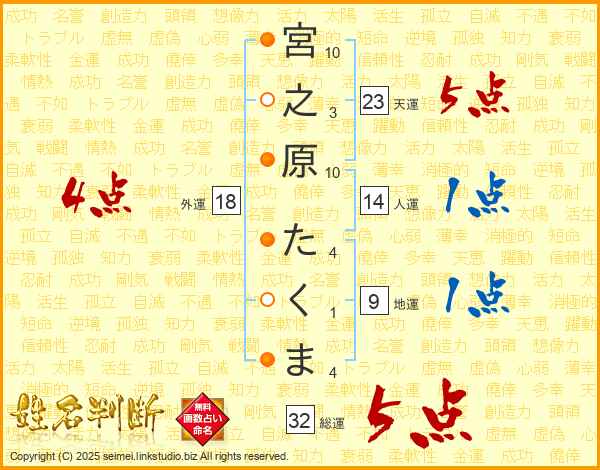 生活面を象徴する運勢です。外部から受ける影響力を表し、結婚運、家庭運や職場、環境への順応性を表します。総運から人運を引いた画数。姓や名が1文字の場合を除く。