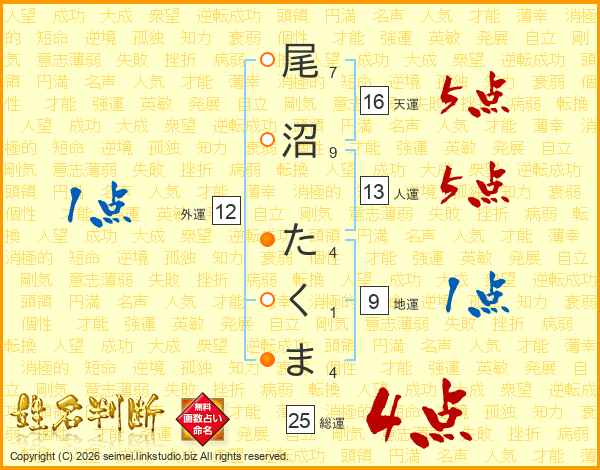 尾(7画)沼(9画) た(4画)く(1画)ま(4画)