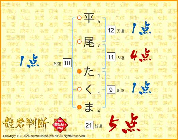 平尾たくまさんの総運は21画の5点!