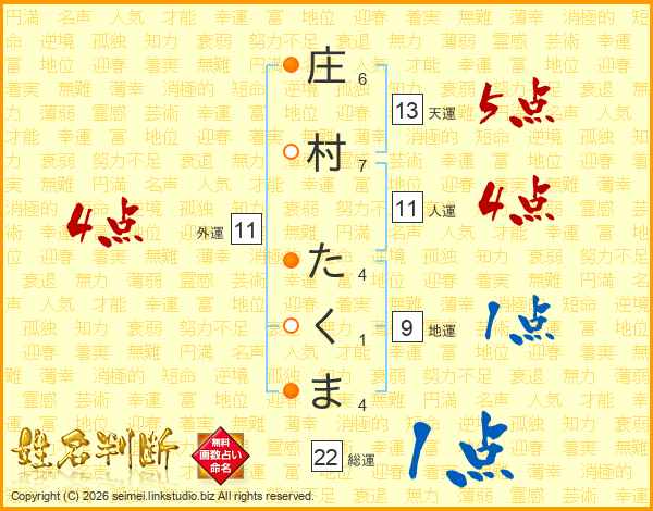 庄(6画)村(7画) た(4画)く(1画)ま(4画)