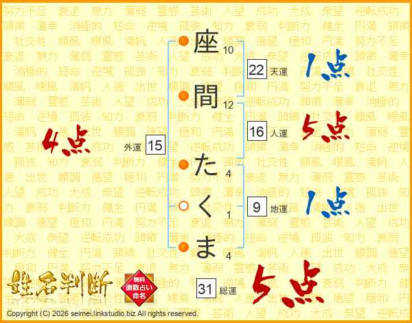 座間たくまさんの総運は31画の5点!