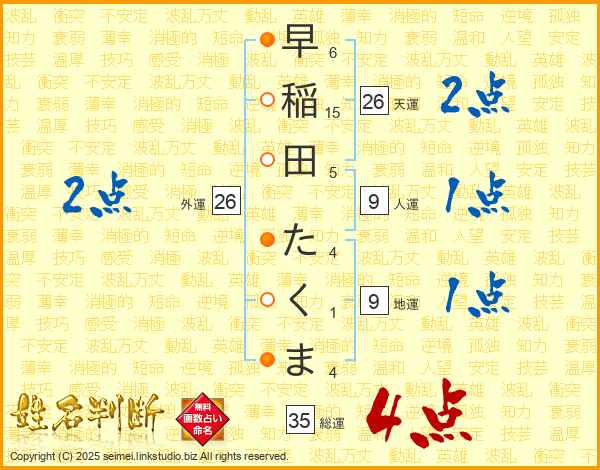 早(6画)稲(15画)田(5画) た(4画)く(1画)ま(4画)