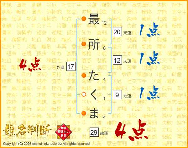 最(12画)所(8画) た(4画)く(1画)ま(4画)
