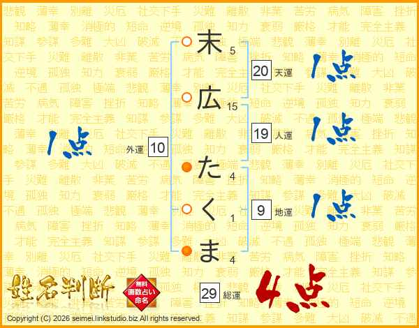 末広たくまさんの総運は29画の4点!