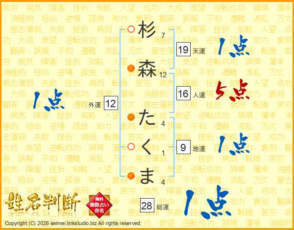 杉森たくまさんの総運は28画の1点!