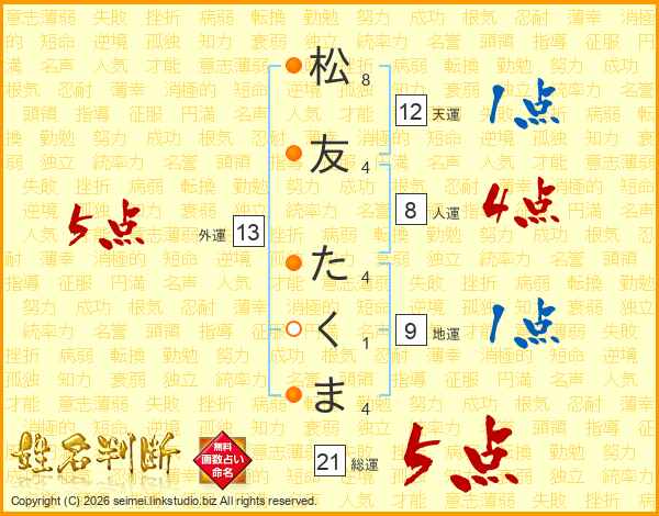 松友たくまさんの総運は21画の5点!